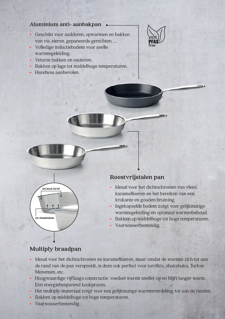 Zoals op de afbeelding aangetoond, deze hoogwaardige collectie bevat aluminium, roestvrij staal en multiply pannen. Hoewel al deze soorten pannen een extra groot oppervlak hebben dankzij hun opstaande randen, hebben ze verschillende toepassingen.
