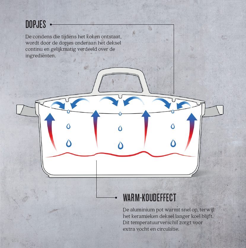 - Ingenieus zelfbevochtigingssysteem: uw gerecht wordt niet eenmaal, maar tweemaal extra bevochtigd in vergelijking met traditionele stoofpotten.