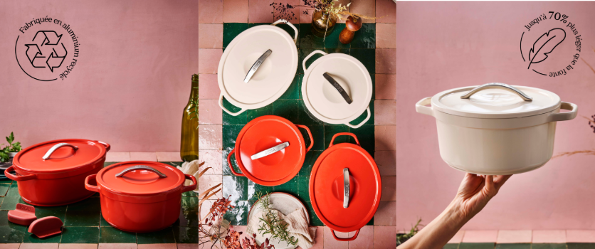 Les cocottes Plume combinent les avantages de la cuisson lente des traditionnels ustensiles en fonte avec la légèreté de l’aluminium recyclé.